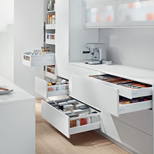 Hvis du er venstrehendt, kan skapene åpnes til venstre. Hvis du vil nå de lengste hjørnene på skapene – er komplette skuffer vår standard, men du kan også være interessert i Cargo. Men hvis du lider av rygg- eller benproblemer – kan du fortsatt bruke de øvre skapene takket være de spesielle senkemekanismene i hyllene.